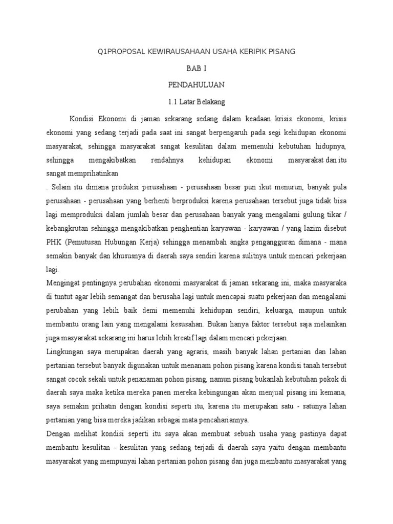 Proposal seni budaya seni musik bab i pendahuluan a. Rasanya yang renyah dan murahnya harga yang g. Dari tugas mata kuliah kewirausahaan dapatlah kami sebuah ide untuk memanfaatkan kulit pisang yang pada umumnya selalu dibuang setelah memakan isinya. January 21, 2018january 21, 2018. Kewirausahaan | contoh proposal usaha.